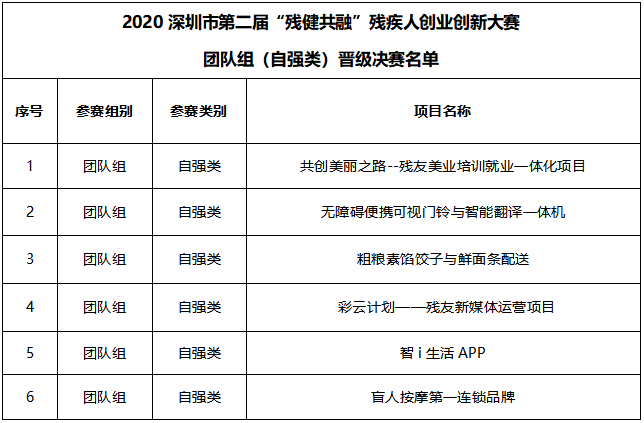 2020深圳市第二屆“殘健共融”殘疾人創(chuàng)業(yè)創(chuàng)新大賽團(tuán)隊組(自強(qiáng)類)晉級決賽名單