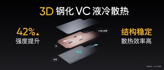 真我GT的性能表現(xiàn),離不開優(yōu)秀散熱技術(shù)的強力支持,創(chuàng)新的3D鋼化液冷散熱不乏好評。作為GT系列戰(zhàn)略成員,真我GT Neo繼承了GT系列的強悍基因,同樣搭載3D鋼化VC液冷散熱。創(chuàng)新的3D鋼化VC液冷散熱不僅大幅度提高了均熱板的強度,同時內(nèi)部的結(jié)構(gòu)優(yōu)化也讓整體的散熱效率進(jìn)一步提升。配合100%覆蓋核心發(fā)熱源的多重立體散熱系統(tǒng),高性能的同時保持冷靜。