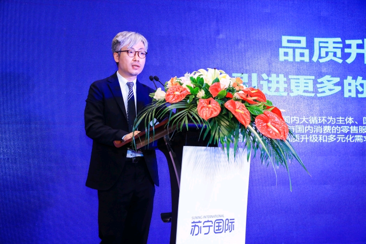 (圖:首屆消博會(huì)期間,蘇寧家樂福商品副總裁陳尚斌在蘇寧國際全球合作伙伴大會(huì)上發(fā)表演講)