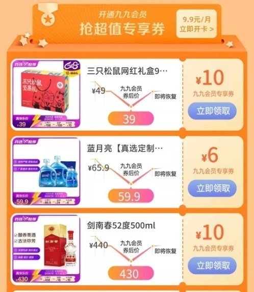 活動(dòng)期間,九九會(huì)員可搶專享大額券,大牌網(wǎng)紅爆品狂歡底價(jià)。三只松鼠網(wǎng)紅堅(jiān)果禮盒998g*2券后價(jià)39元,藍(lán)月亮洗衣液禮包券后價(jià)59.9元,劍南春52度500ml酒券后價(jià)430元......實(shí)實(shí)在在讓用戶買(mǎi)到“真低價(jià)”,買(mǎi)的“真值得”!