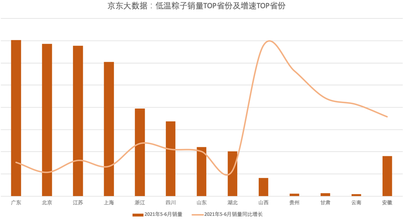 與低溫發(fā)展趨同的,還有平臺(tái)助力食品企業(yè)數(shù)字化和渠道完善帶來(lái)的整個(gè)行業(yè)對(duì)下沉市場(chǎng)的發(fā)掘——從銷(xiāo)量看北京、廣東及江浙滬等發(fā)達(dá)地區(qū)是低溫粽子的主要消費(fèi)區(qū)域,四川、山東、湖北等省緊隨其后。而隨著京東冷鏈和物流的下沉和完善,山西、貴州、甘肅、云南、安徽等省區(qū)的增速位列全國(guó)前五。