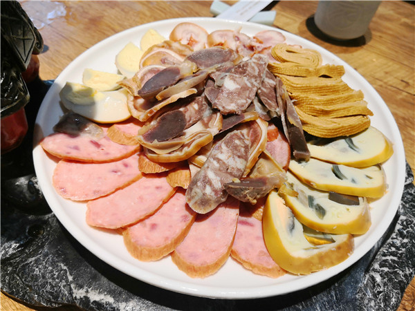 尤其扎眼的,正對大門的明廚亮灶上的幾塊牌匾,一下子就勾起人的食欲:老式熏豬手、手工燒老雞、烏蘇里江鰉魚、興凱湖大白魚、查干湖胖頭魚、火夫灶羊腿。這些都是地道的東北味?。?jù)介紹,老板湯長明是黑龍江“龍菜”系傳承領(lǐng)軍人物,祖孫四代傳承東北菜廚藝,現(xiàn)在關(guān)東大院餐飲集團(tuán)董事長。當(dāng)然,許多大家耳熟能詳?shù)拇蟊姴艘矐?yīng)有盡有,如:殺豬菜、小雞燉蘑菇、得莫利燉魚、大鵝燉寬粉、黑皮肘子、酸菜粉、地三鮮、東北鹵水點(diǎn)豆腐、金湯遼參、黃魚燒土豆、紅燒肉黃金勾......看得人口水直冒。加之,整個(gè)門店的布局也十分特別,一樓明廚亮灶之外,主要是大堂散座,周邊還有不少的書籍、酒架;二樓主要是包間,簡潔明亮。可以說,在此可以感受到一股濃濃的關(guān)東風(fēng)情。