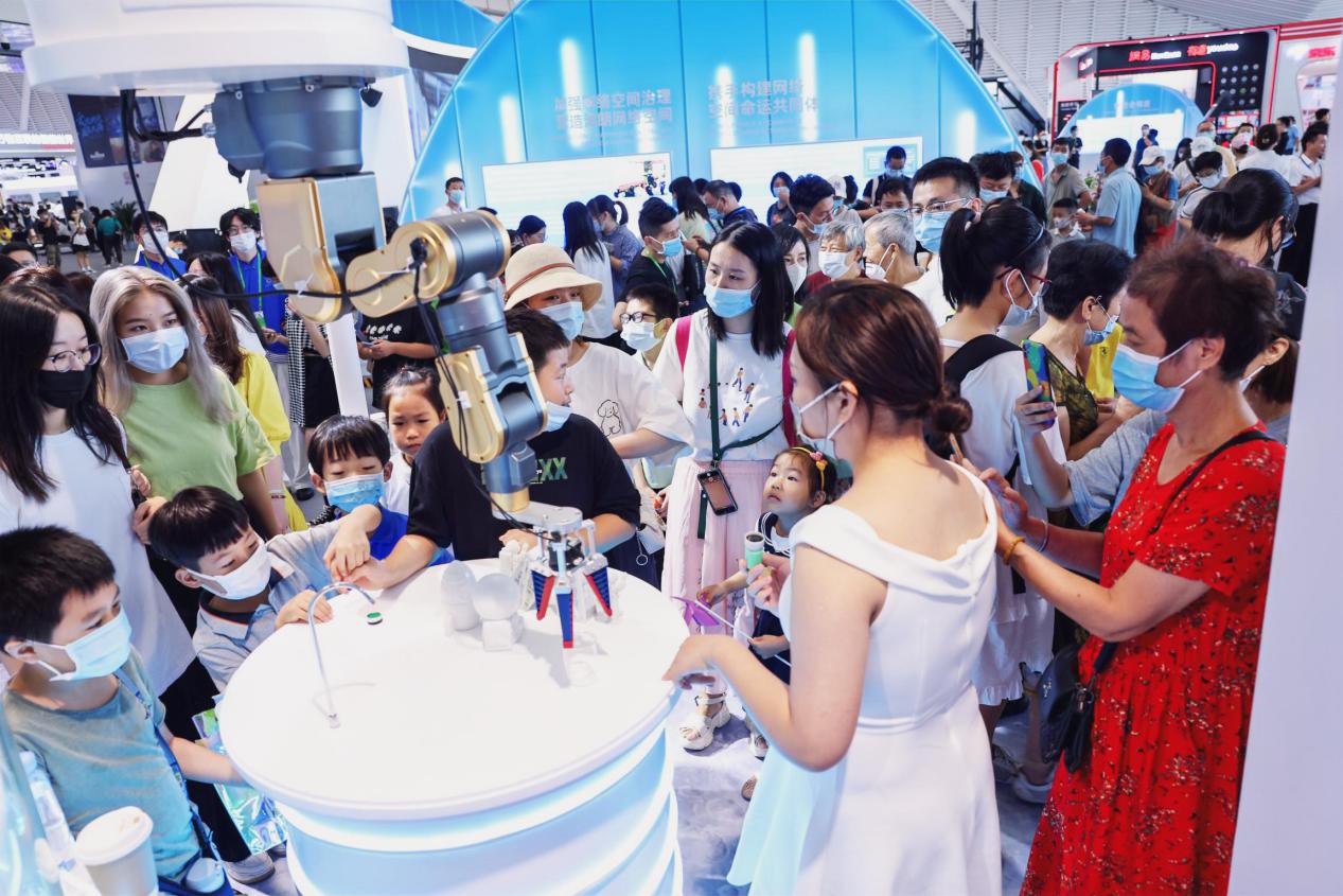 這牛奶和其他的不太一樣,很香濃?!半x心精萃‘白科技’開啟臻濃新紀元”展臺一直就是博覽會現(xiàn)場的“人氣王”,這里以宇宙探索為主題,科幻感十足,火箭發(fā)動機噴出淡淡煙霧,三臺智能機械臂不停忙碌,人們排起長隊,品嘗由“離心精萃科技”現(xiàn)場調(diào)制的伊利臻濃牛奶。在這里,吸引觀眾的不僅是美味的伊利牛奶,也有滿滿的數(shù)字科技。