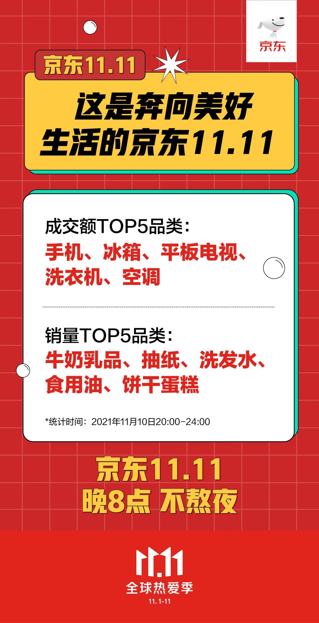 從10日晚8點(diǎn)到11日0點(diǎn)短短4小時(shí)內(nèi),可以看到消費(fèi)者對(duì)美好生活的向往和對(duì)消費(fèi)升級(jí)的追求。其中成交額TOP5品類(lèi):手機(jī)、冰箱、平板電視、洗衣機(jī)、空調(diào);銷(xiāo)量TOP5品類(lèi):牛奶乳品、抽紙、洗發(fā)水、食用油、餅干蛋糕。