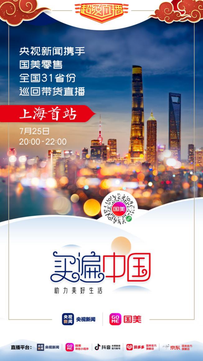 7月25日晚8點,“買遍中國·助力美好生活——央視新聞&國美零售全國31省份巡回帶貨直播”首場將在上海復(fù)星藝術(shù)中心正式啟動,這也是國美首次將超級直播搬到戶外來舉辦。