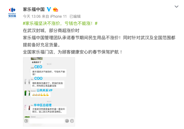 家樂福中國官方微博發(fā)布了一條關于#家樂福堅決不漲價,虧錢也不能漲!#的微博表示,家樂福中國管理團隊承諾春節(jié)期間民生用品不漲價。