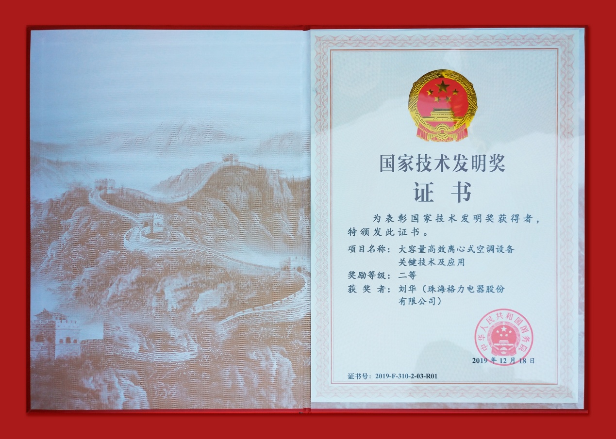 2019年度國家科學技術獎在人民大會堂頒布,格力大容量高效離心式空調設備關鍵技術獲得國家技術發(fā)明獎二等獎。