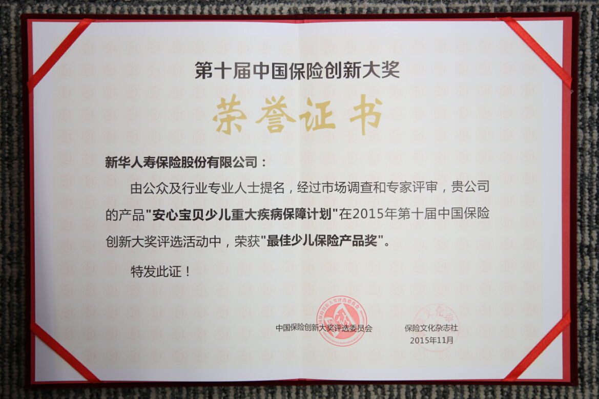 2015年最佳少兒保險(xiǎn)產(chǎn)品獎(jiǎng)