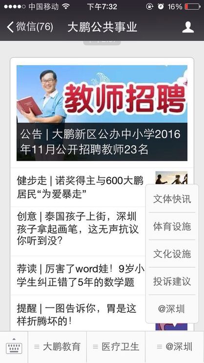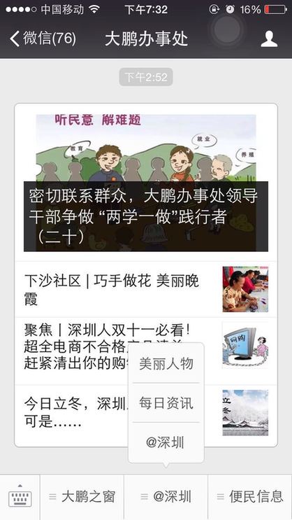 ??? 截止到11月7日,大鵬新區(qū)已有大鵬先鋒、大鵬新區(qū)社區(qū)家園網(wǎng)、大鵬公共事業(yè)、筑夢大鵬、、大鵬辦事處等多家政府官方微信公眾號(hào)入駐了@深圳。
