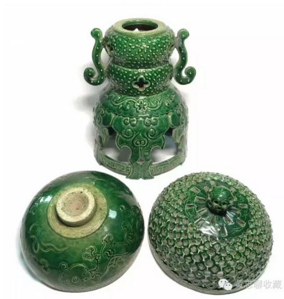 香薰在古代是頗為流行的室內(nèi)陳設(shè)用器,形制多樣,材質(zhì)不一。漢唐時(shí)期出土的香薰眾多,如有名的漢代博山爐,唐代香薰球等。兩宋時(shí)期,實(shí)行文人治國(guó),香具更是盛行,影響所及,同時(shí)并存的遼、金兩朝也頗為風(fēng)行。當(dāng)然,香具中也區(qū)分宅舍用及寺廟用、宮殿用等。其中寺廟及宮殿用品多為成對(duì)擺放,講究對(duì)稱之美,顯得莊重大方。而宅舍之用更為推崇雅致,趣味。下面介紹的這件綠釉香薰應(yīng)為遼金時(shí)期的寺廟用品。 香薰高31.5cm、直徑14.5cm,整體呈豆式。豆是先秦禮器,用以在祭祀、宴饗中盛放肉食。在家廟祭祀中,豆是不可或缺的禮儀用具,早期豆用竹編成,后用青銅鑄造,因此在禮書中稱“籩豆”。此對(duì)香薰延續(xù)了青銅豆的大體形制,上作球形,香盤半圓,蓋為鏤空半圓,扣合后渾然如一。香盤可拆卸,安插于支座上。座上部為雙扁圓狀疊壓,兩側(cè)裝飾螭龍耳;下部呈鏤空裙擺式,承以托泥,穩(wěn)重大方。通體施綠釉,釉面潤(rùn)澤,純凈自然。器身點(diǎn)綴穿花龍紋,如意紋,加之裙擺上的龕形開光,推測(cè)為當(dāng)時(shí)高等級(jí)的寺廟的佛前薰香供器。 欣賞更多藏品,歡迎瀏覽【黃志博物館】網(wǎng)站。 我們會(huì)介紹更多的收藏知識(shí)、推薦更多優(yōu)質(zhì)優(yōu)價(jià)的藏品供您了解和選擇,也歡迎您把這些分享給朋友們,讓大家一起來了解歷史文化、體會(huì)收藏的快樂!