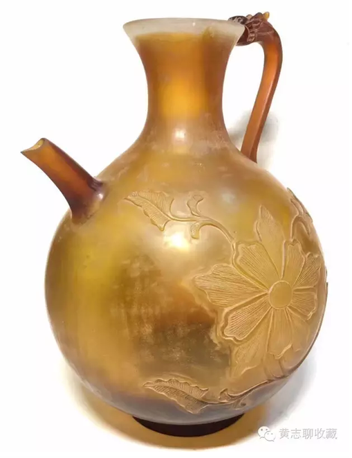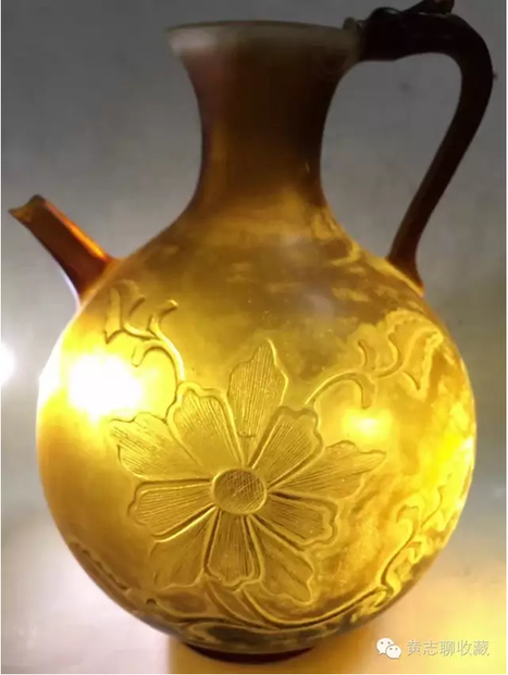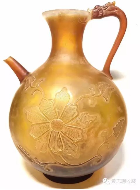 琉璃在唐代極為名貴。這從史書記載可窺一二。房玄齡的《晉書》中有關(guān)于琉璃器的記載“(王濟(jì))性豪侈,麗服玉食……帝嘗幸其宅,供饌甚豐,悉貯琉璃器中?!蓖鯘?jì)在招待皇帝時(shí)用了成套的琉璃碗盤,以逞其豪富,可見當(dāng)時(shí)琉璃器之貴重或要超過(guò)金、銀等器。又如宋代司馬光主編的《資治通鑒》中記載了這樣一段歷史事實(shí):嶺南節(jié)度使路嗣恭在平息叛亂中趁機(jī)劫掠商民,得到了大批財(cái)物。他把其中一個(gè)直徑九寸的琉璃盤獻(xiàn)給了唐代宗。唐代宗非常高興,“以為至寶”。法門寺地宮出土的唐代琉璃器大多為皇家捐贈(zèng)的禮佛之物也可佐證其珍貴。 這件執(zhí)壺為琉璃材質(zhì),高20cm、腹徑14.5cm,色澤黃褐,半透明,晶瑩潤(rùn)澤,光澤柔和。小口,束頸,腹部圓鼓,餅足;前有直流,后為龍柄。整體形制穩(wěn)重大方,圓潤(rùn)飽滿,具有典型的唐代特征。壺身兩面刻有菊紋,線條流暢自然,勁健有力。整體透入出唐人的灑脫自信。這類唐代的琉璃作品存世極少,目前為數(shù)不多的一些作品大多出自窖藏、地宮及貴族墓葬,屬于珍稀文物。此件執(zhí)壺保存完整,尤為難得。 欣賞更多藏品,歡迎瀏覽【黃志博物館】網(wǎng)站:www.huangzhimuseum.com?