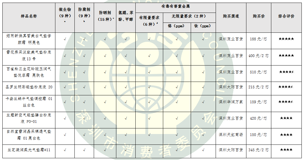 為給消費(fèi)者提供科學(xué)合理的消費(fèi)指引,深圳市消費(fèi)者委員會(huì)聯(lián)合福田區(qū)消費(fèi)者委員會(huì)、寶安區(qū)消費(fèi)者委員會(huì)委托深圳市品質(zhì)消費(fèi)研究院開(kāi)展氣墊粉底比較試驗(yàn)。本次比較試驗(yàn)委托第三方權(quán)威檢測(cè)機(jī)構(gòu)進(jìn)行檢測(cè),對(duì)國(guó)內(nèi)外8個(gè)知名品牌氣墊粉底的安全性和感官性進(jìn)行了比拼。