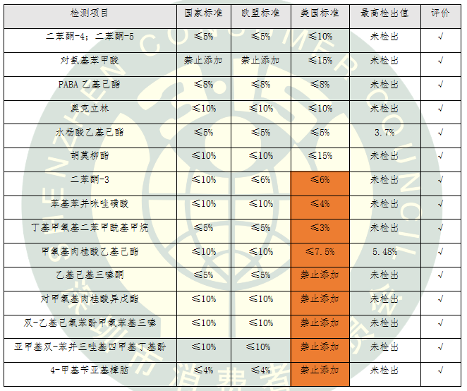 防曬化妝品在美國(guó)按非處方藥(OTC)管理,新的防曬劑當(dāng)作新藥品來(lái)批準(zhǔn),審評(píng)要求非常嚴(yán)格。本次比較試驗(yàn)測(cè)試的15類化學(xué)防曬劑按照國(guó)標(biāo)、歐標(biāo)和美標(biāo)中最嚴(yán)格的標(biāo)準(zhǔn)進(jìn)行評(píng)價(jià)。我國(guó)允許使用的5類化學(xué)防曬劑在美國(guó)被禁止使用,還有4類化學(xué)防曬劑在美國(guó)的限量要求更加嚴(yán)格。
