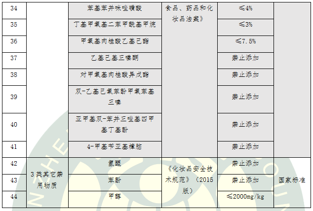 c.防曬劑(15種):苯基苯并咪唑磺酸、二苯酮 -4和二苯酮-5、對(duì)氨基苯甲酸、對(duì)甲氧基肉桂酸異戊酯、 PABA乙基己酯、丁基甲氧基二苯甲?;淄椤W克立林、甲氧基肉桂酸乙基己酯、水楊酸乙基己酯、胡莫柳酯、乙基己基三嗪酮、亞甲基雙 -苯并三唑基四甲基丁基酚、雙 -乙基己氧苯酚甲氧苯基三嗪、二苯酮 -3、4-甲基芐亞基樟腦