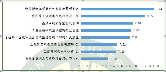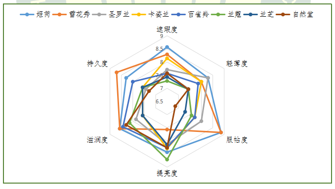 獲得本次感官評(píng)價(jià)單項(xiàng)指標(biāo)得分最好的品牌:遮瑕度為姬芮,得分8.57;持久度為雪花秀,得分8.71;滋潤(rùn)度為雪花秀和姬芮,得分8.57;提亮度為蘭蔻,得分8.71;服帖度為雪花秀和姬芮,得分8.86;輕薄度為圣羅蘭和姬芮,得分8.29。