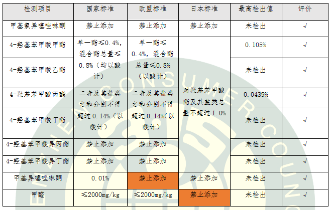 (三)安全評(píng)價(jià)結(jié)果:8款產(chǎn)品安全性均獲五星卓越評(píng)價(jià),所測(cè)項(xiàng)目包括微生物、重金屬、防腐劑和化學(xué)防曬劑等44項(xiàng)指標(biāo),不僅符合國(guó)家標(biāo)準(zhǔn)要求,且符合歐盟(包含德國(guó))、美國(guó)和日本的標(biāo)準(zhǔn)要求。