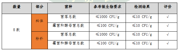歐盟對(duì)化妝品中微生物要求更加嚴(yán)格,國(guó)標(biāo)要求5項(xiàng),歐標(biāo)要求9項(xiàng)。檢測(cè)結(jié)果顯示:8款氣墊粉底微生物檢測(cè)結(jié)果不僅符合國(guó)家標(biāo)準(zhǔn)要求,而且符合歐盟法規(guī)要求。
