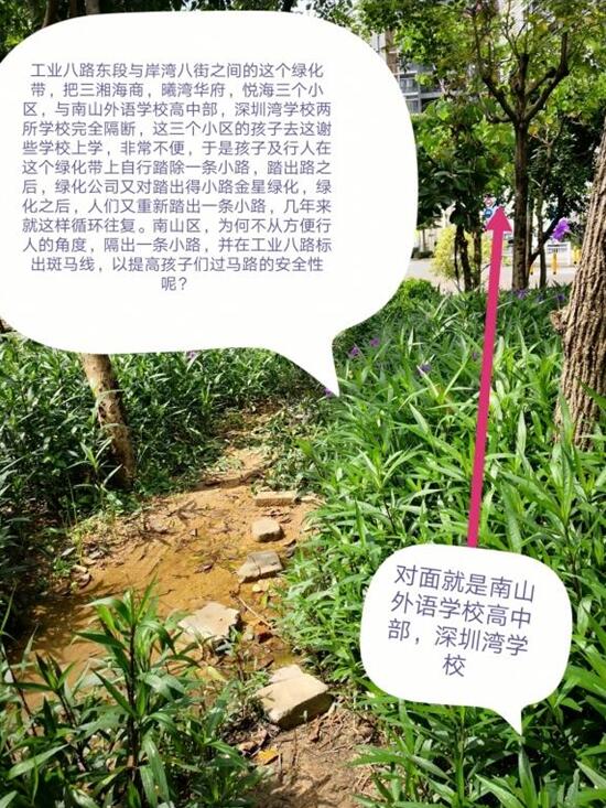 南山區(qū)蛇口街道辦就此事回應稱,街道已要求園林綠化公司對該處加強監(jiān)管,及時補植踩出的空地。同時提醒市民朋友,遵守交通規(guī)則,不要違法穿越綠化帶。在交通部門尚未做好規(guī)劃前,通行沿交通路口斑馬線行走。