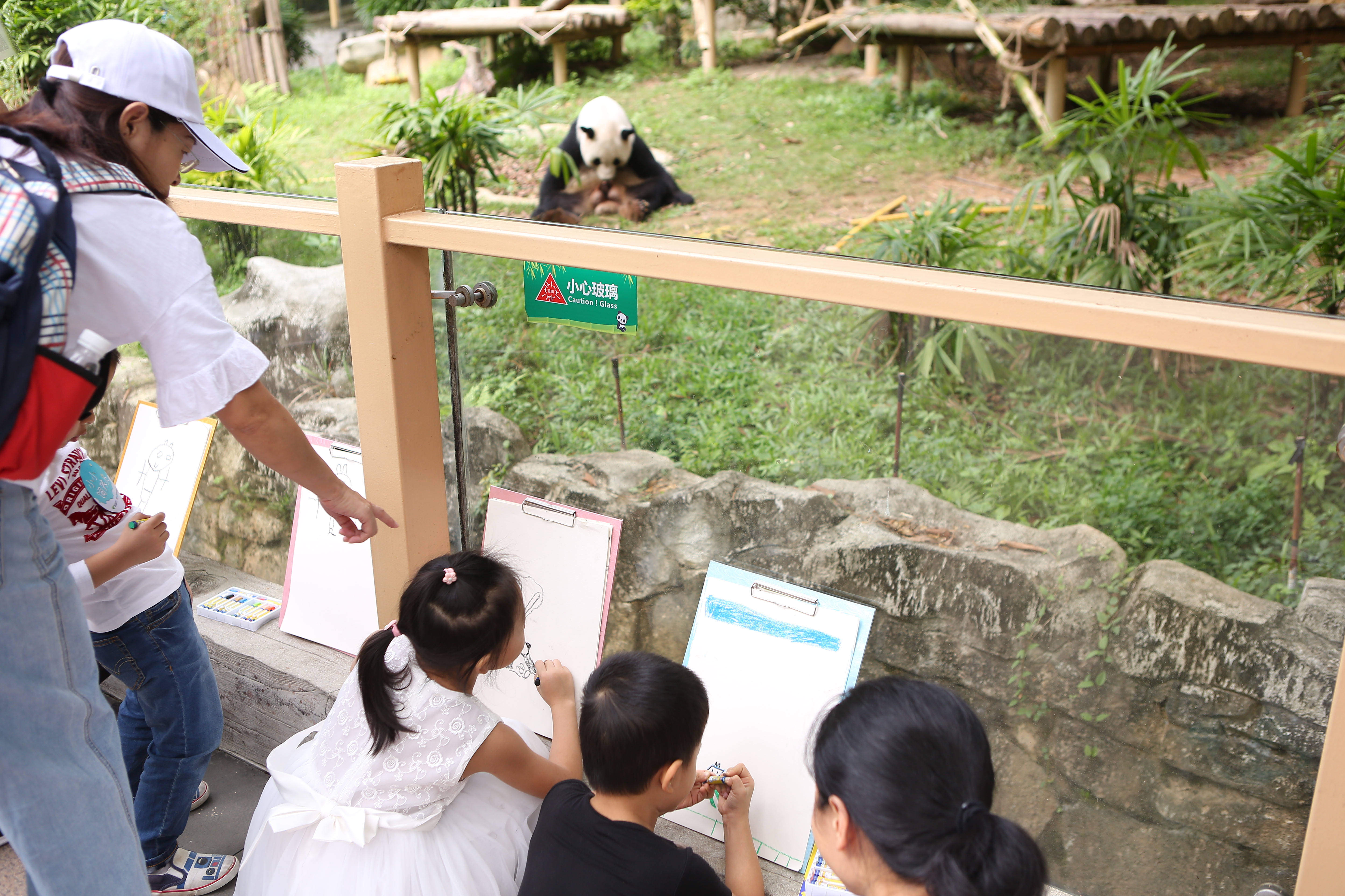 猿猴村的后面,是國寶大熊貓的家——熊貓莊園。小朋友們來到這里,瞬間被大熊貓圓滾滾的萌態(tài)所吸引。他們或坐或站,拿起畫板,完成了從“小飼養(yǎng)員”到“小畫家”的角色轉(zhuǎn)變。在認(rèn)真觀察大熊貓后,小朋友們揮動(dòng)手中的畫筆,將它們的萌態(tài)一一呈現(xiàn)在畫板上。