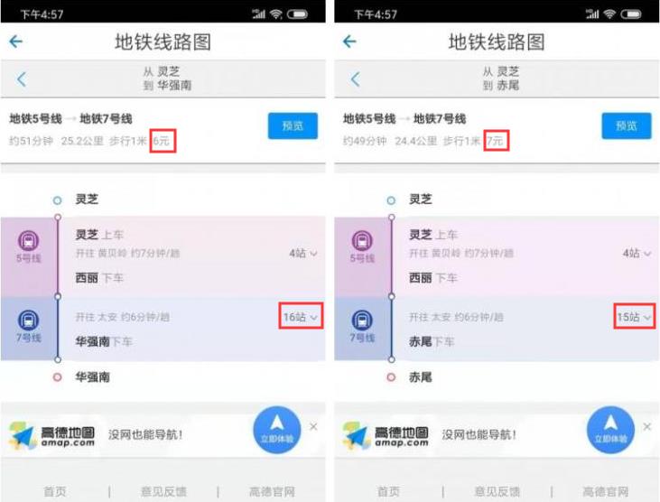 兩次乘車線路的手機(jī)截圖對(duì)比(供圖者@吾非魚)