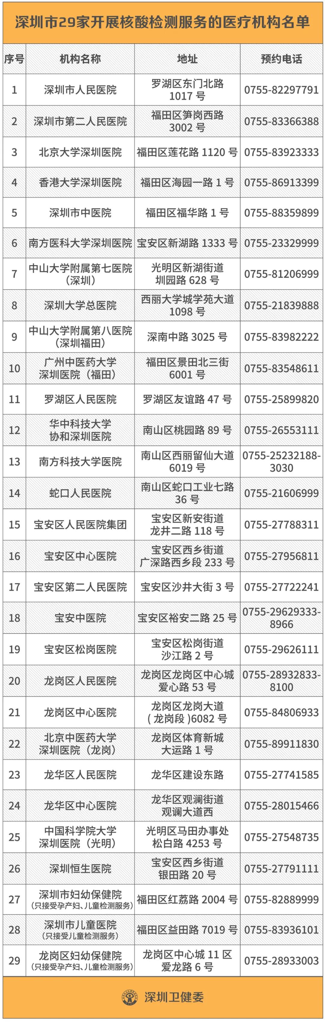 跨境學(xué)生可聯(lián)系全市提供核酸檢測的29家醫(yī)療機構(gòu)(詳見附件,含醫(yī)院名稱、地址和聯(lián)系電話)中的任意一家進行檢測,部分醫(yī)院有預(yù)約要求,部分醫(yī)院對檢測服務(wù)時間有限定,因此首次前往檢測前,請先拔打聯(lián)系電話了解醫(yī)院是否需要預(yù)約和服務(wù)時間安排。