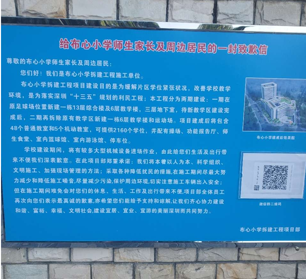 11月9日,有市民在深圳論壇發(fā)帖反映稱,“小孩如今就讀布心小學(xué)??砷_學(xué)一個月后,就看到校內(nèi)有公示說學(xué)校將會原地重建?!痹摷议L對學(xué)生的安全情況表示擔(dān)憂:“這幾年因地下結(jié)構(gòu)受影響而導(dǎo)致路面坍塌的情況時有發(fā)生,現(xiàn)如今要在與教室目測距離不超過五米的地方建兩座分別為13層和6層的建筑,這樣大的工程量如果不分流,施工風(fēng)險可想而知。即使重建采用高新技術(shù),能夠保證教室的安全,但學(xué)生又如何能在學(xué)校與工地的混合期里度過至少四年以上的工期?粉塵和噪音對學(xué)生的影響也很大也可想而知。”