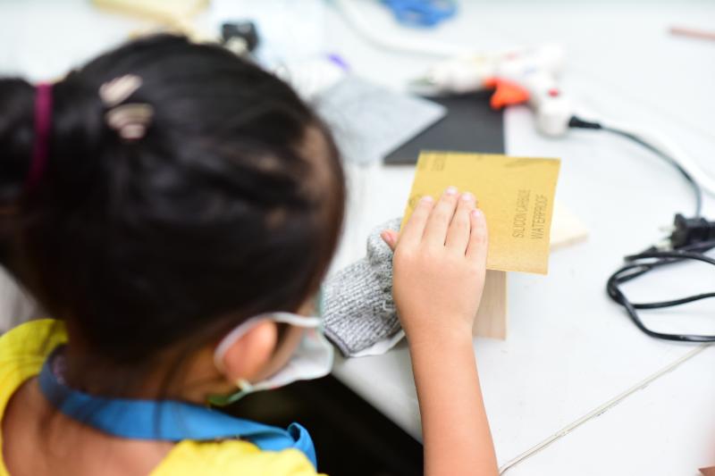 對(duì)于“小小木匠”來說,安安靜靜的坐下來,發(fā)揮想象力,傾心打造屬于自己的木質(zhì)音樂盒,無疑是最開心的時(shí)刻。聽完老師的講解后,小朋友們迅速進(jìn)入角色,他們拿著原料木材,一個(gè)個(gè)化身“小魯班”,用尺子“計(jì)較長(zhǎng)短”,為它們“改頭換面”起來?;顒?dòng)現(xiàn)場(chǎng),一位小朋友正拿著砂紙,小心翼翼的打磨木料,再問及他打磨的工序時(shí),小朋友頗具匠心的告誡記者:“先要用這種粗一點(diǎn)的砂紙打磨,再用這個(gè)細(xì)的,這樣打磨出來的音樂盒表面就特別光滑啦……”
