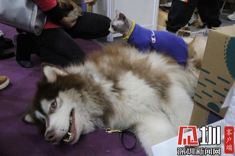 展商的無(wú)毛貓正坐在一只阿拉斯加犬身上四處張望。