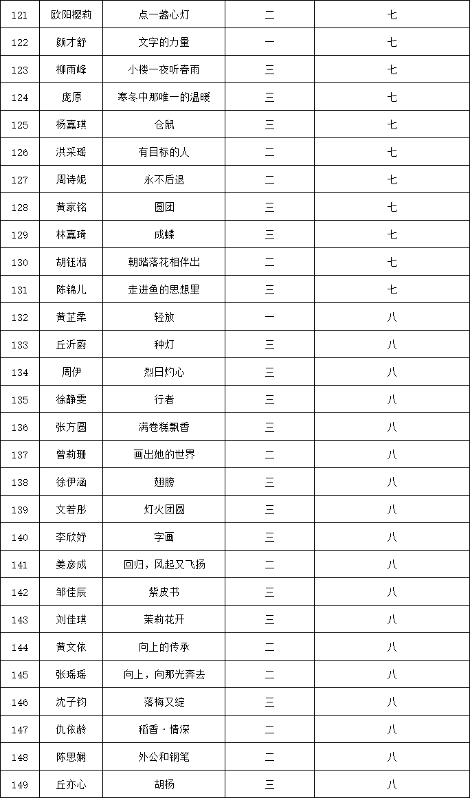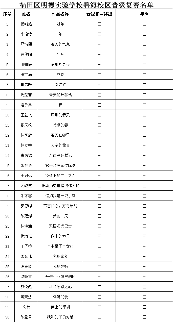 自2021年1月,活動(dòng)征稿啟動(dòng)以來(lái),獲得了深圳市廣大中小學(xué)生、教師、文學(xué)愛好者的熱烈響應(yīng)積極參與,吸引了深圳百余所學(xué)校的上萬(wàn)人關(guān)注報(bào)名?,F(xiàn)公布福田區(qū)明德實(shí)驗(yàn)學(xué)校碧海校區(qū)專場(chǎng)晉級(jí)復(fù)賽名單如下: