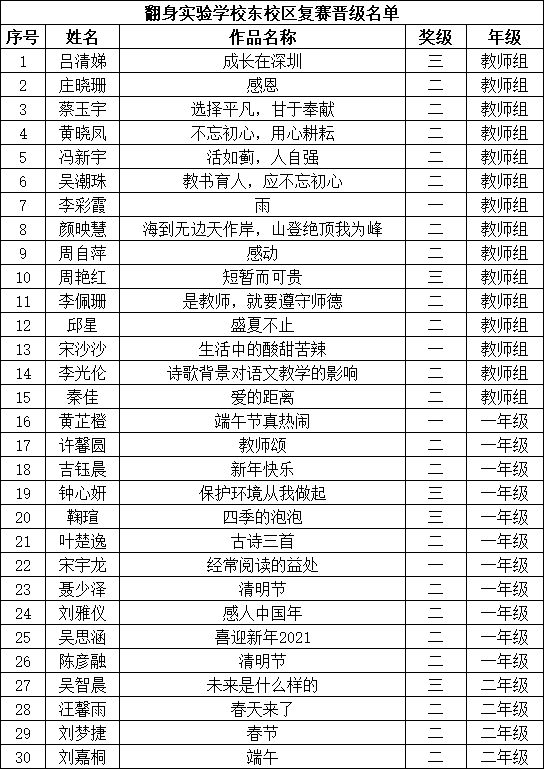 自2021年1月,活動(dòng)征稿啟動(dòng)以來(lái),獲得了深圳市廣大中小學(xué)生、教師、文學(xué)愛(ài)好者的熱烈響應(yīng)積極參與,吸引了深圳百余所學(xué)校的上萬(wàn)人關(guān)注報(bào)名?,F(xiàn)公布寶安區(qū)翻身實(shí)驗(yàn)學(xué)校(東校區(qū))晉級(jí)復(fù)賽名單如下: