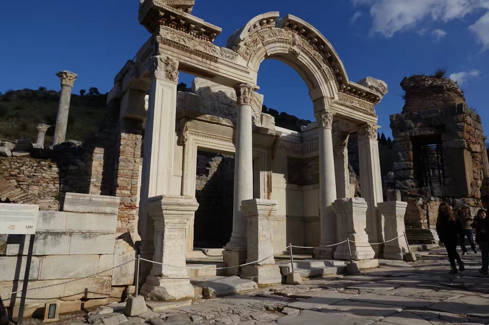 哈德良神廟就在圖書(shū)館斜對(duì)面,是典型柯林斯式神廟的代表,內(nèi)墻廊柱上有不同神話人物的雕刻,拱門上有精美的浮雕,前側(cè)拱門上是幸運(yùn)女神的頭像,內(nèi)側(cè)拱門上是張開(kāi)雙臂的蛇發(fā)女妖美杜莎的雕像。李仁奇 攝