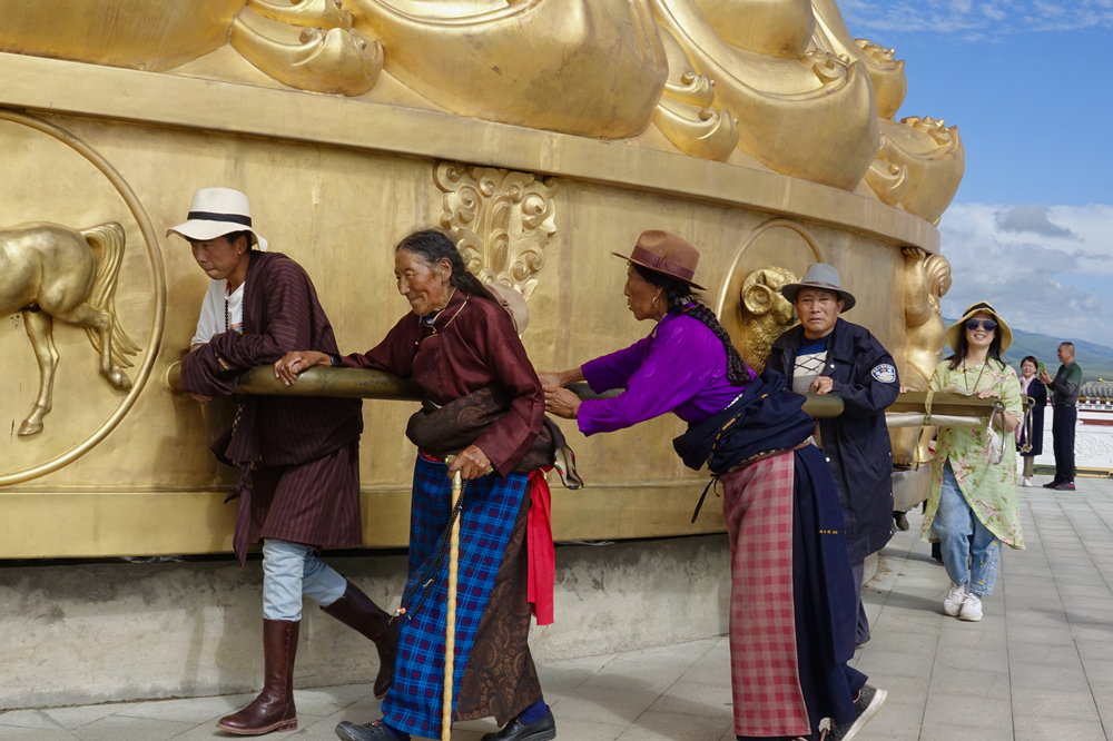 據(jù)傳,轉(zhuǎn)動(dòng)經(jīng)輪一周,即等同于念誦《大藏經(jīng)》一遍。藏傳佛教認(rèn)為,“持頌真言越多,越表明對(duì)佛的虔誠(chéng),可得脫輪回之苦”。李仁奇 攝