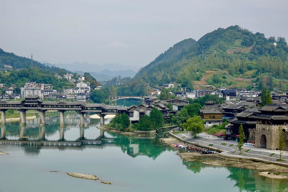 橫跨于濯水古鎮(zhèn)阿蓬江上的超長廊橋有“世界第一風(fēng)雨廊橋”之稱。李仁奇 攝
