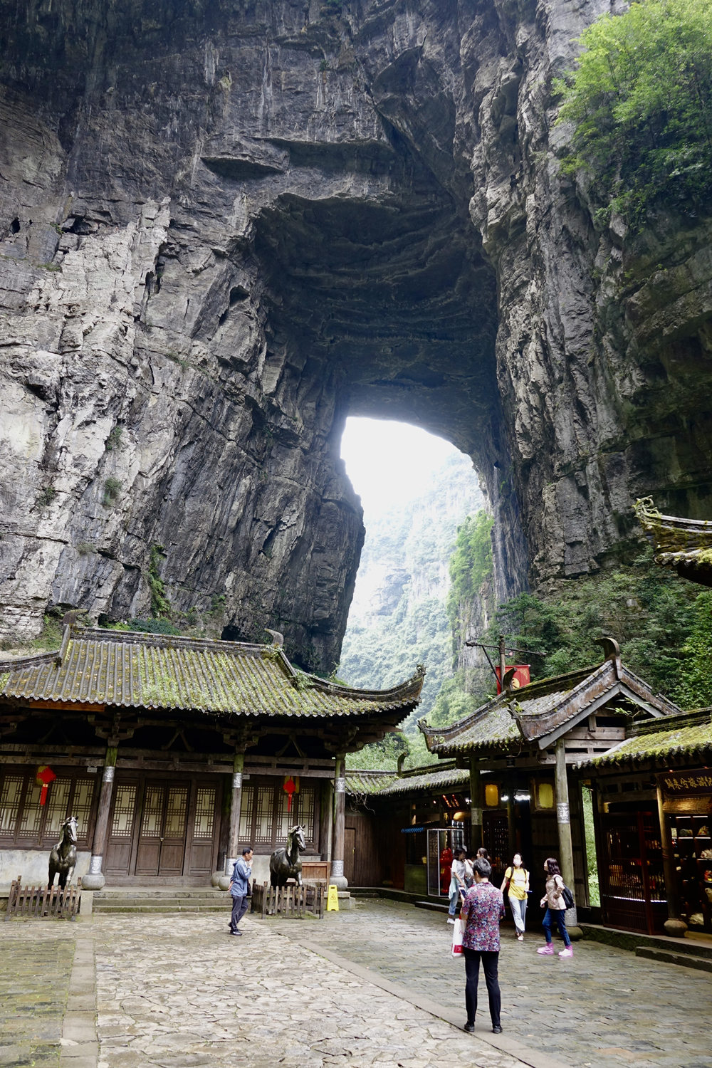 天龍橋?yàn)檠蛩訊{谷上的第一座天生橋,又名頭道橋,高大厚重、磅礴氣勢,以雄壯稱奇。橋高235m,橋厚150m,平均拱橋高度96m。拱孔跨度20-75m,平均34m,橋面寬度147m。李仁奇 攝