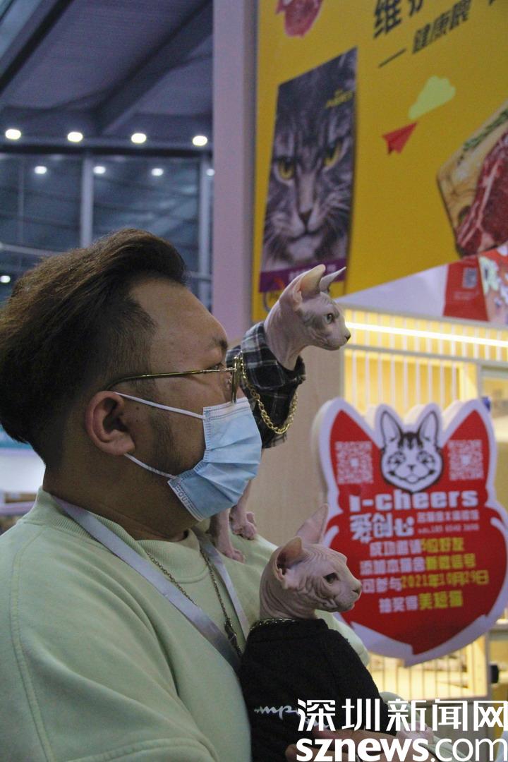 黏人的無毛貓與主人一同逛展。