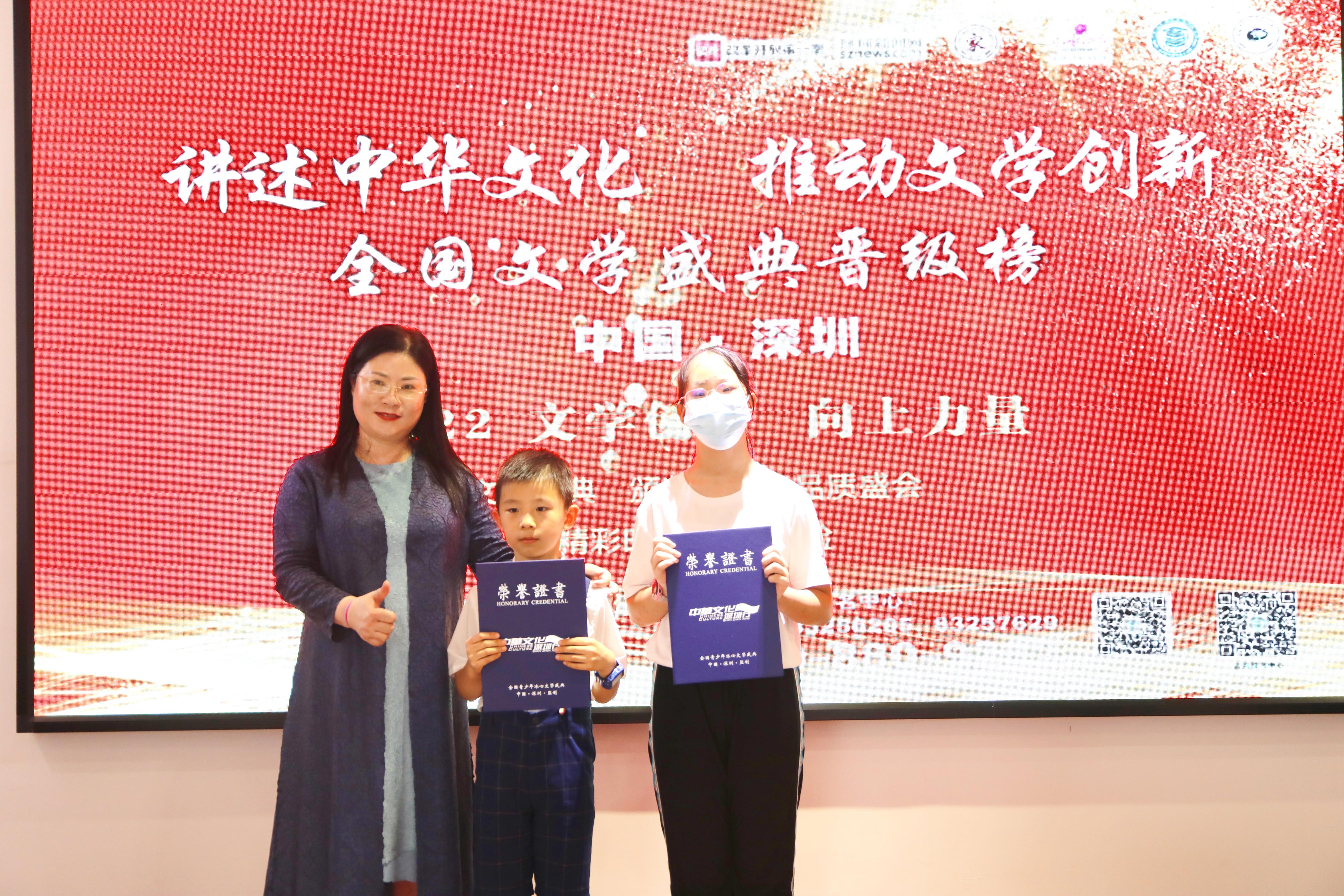 全國文學(xué)盛典聯(lián)合發(fā)起人、創(chuàng)始人肖硯寧為優(yōu)生代表頒獎并合影