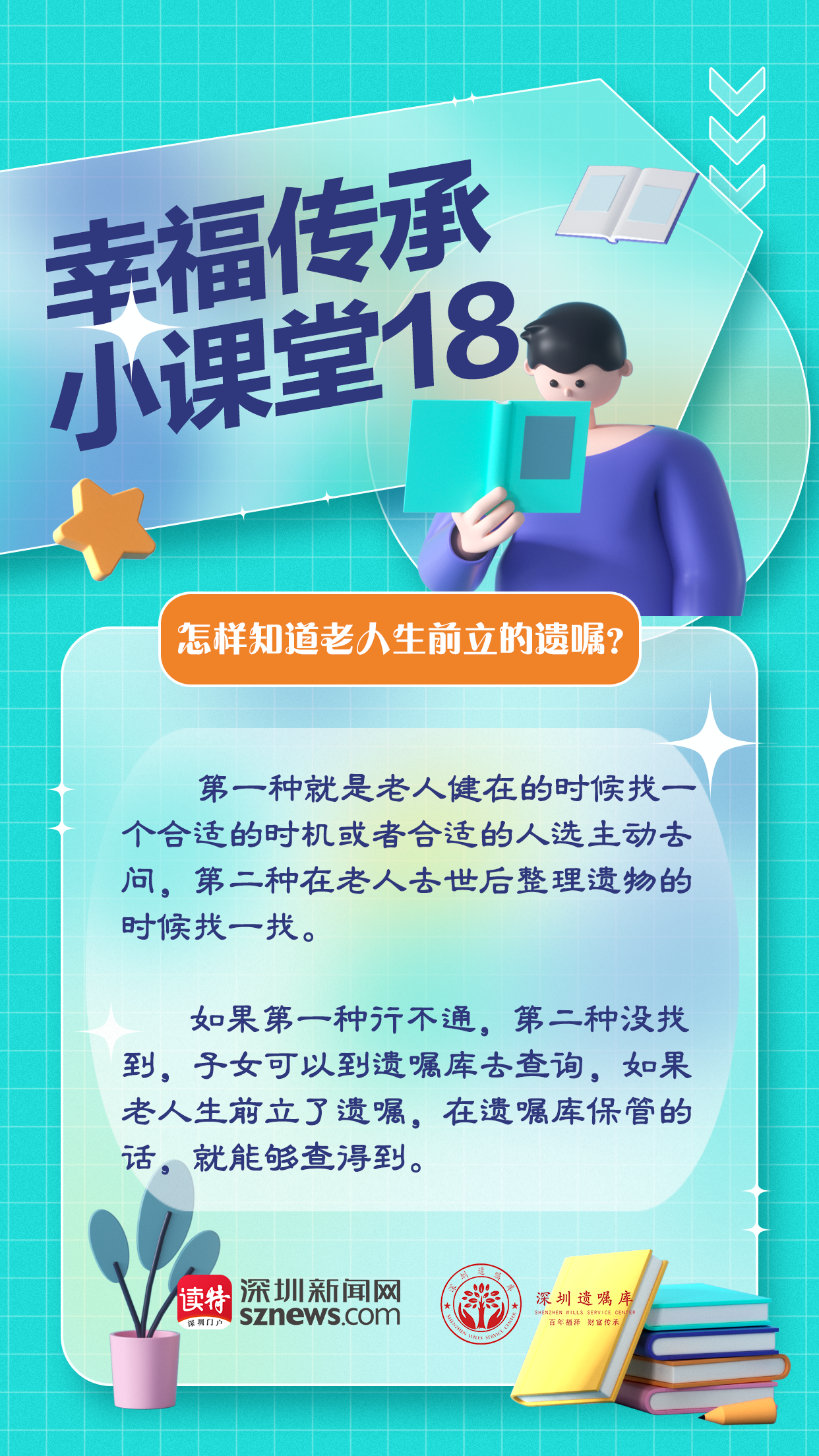 還有一種方法是在老人去世后整理遺物的時候可能發(fā)現(xiàn)書面遺囑。當然還有第三種辦法。由深圳新聞網(wǎng)聯(lián)合廣東嘉得信律師事務(wù)所、深圳遺囑庫特別策劃的“幸福傳承小課堂”第18期,我們來聊聊第三種辦法查詢老人生前立的遺囑。如果第一種辦法行不通,第二種辦法又找不到的話,我們的建議是,可以去遺囑庫查詢。在老人去世后,如果老人生前立了遺囑,在遺囑庫保存的話,就可以找得到。