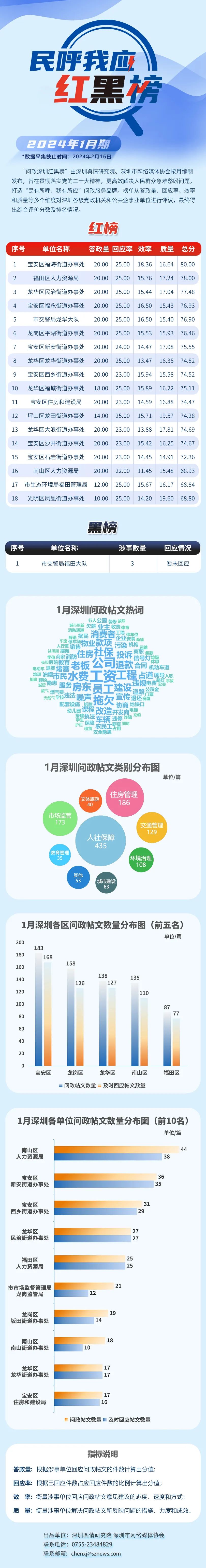 深圳新聞網(wǎng)3月2日訊(記者 陳曉君 實習生 蔡曉婷)2024年2月27日,深圳輿情研究院、深圳市網(wǎng)絡媒體協(xié)會編制推出1月期“深圳民呼我應紅黑榜”,以表彰高質(zhì)效解決民生訴求的單位,提醒答政履職主動性較弱的單位。本期共計19家單位登榜,包括紅榜單位18家,黑榜單位1家。較上期榜單,紅榜單位數(shù)量增加,黑榜單位數(shù)量持平。