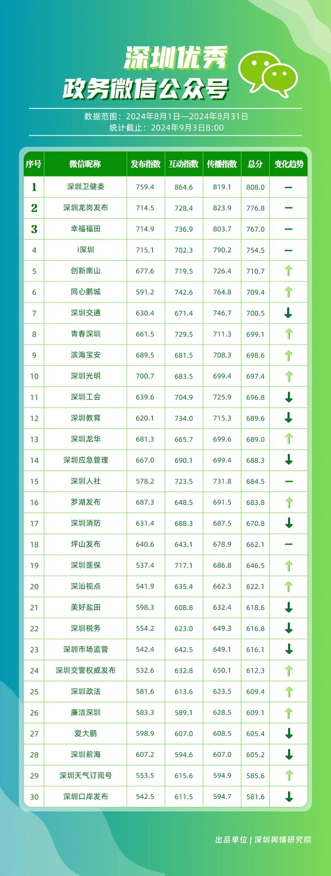 8月,“深圳衛(wèi)健委”“深圳龍崗發(fā)布”“幸福福田”“i深圳”“創(chuàng)新南山”“同心鵬城”“深圳交通”“青春深圳”“濱海寶安”“深圳光明”等30個賬號入選“深圳優(yōu)秀政務(wù)微信公眾號”。其中,榜單前四名的“深圳衛(wèi)健委”“深圳龍崗發(fā)布”“幸福福田”“i深圳”以其高質(zhì)量的內(nèi)容和有效的信息傳播策略,持續(xù)獲得公眾較高關(guān)注度,排名未產(chǎn)生變動。緊隨其后的“創(chuàng)新南山”“同心鵬城”“深圳交通”等賬號也在內(nèi)容風(fēng)格、質(zhì)量等方面展現(xiàn)了非凡的實(shí)力,獲得了積極反響。