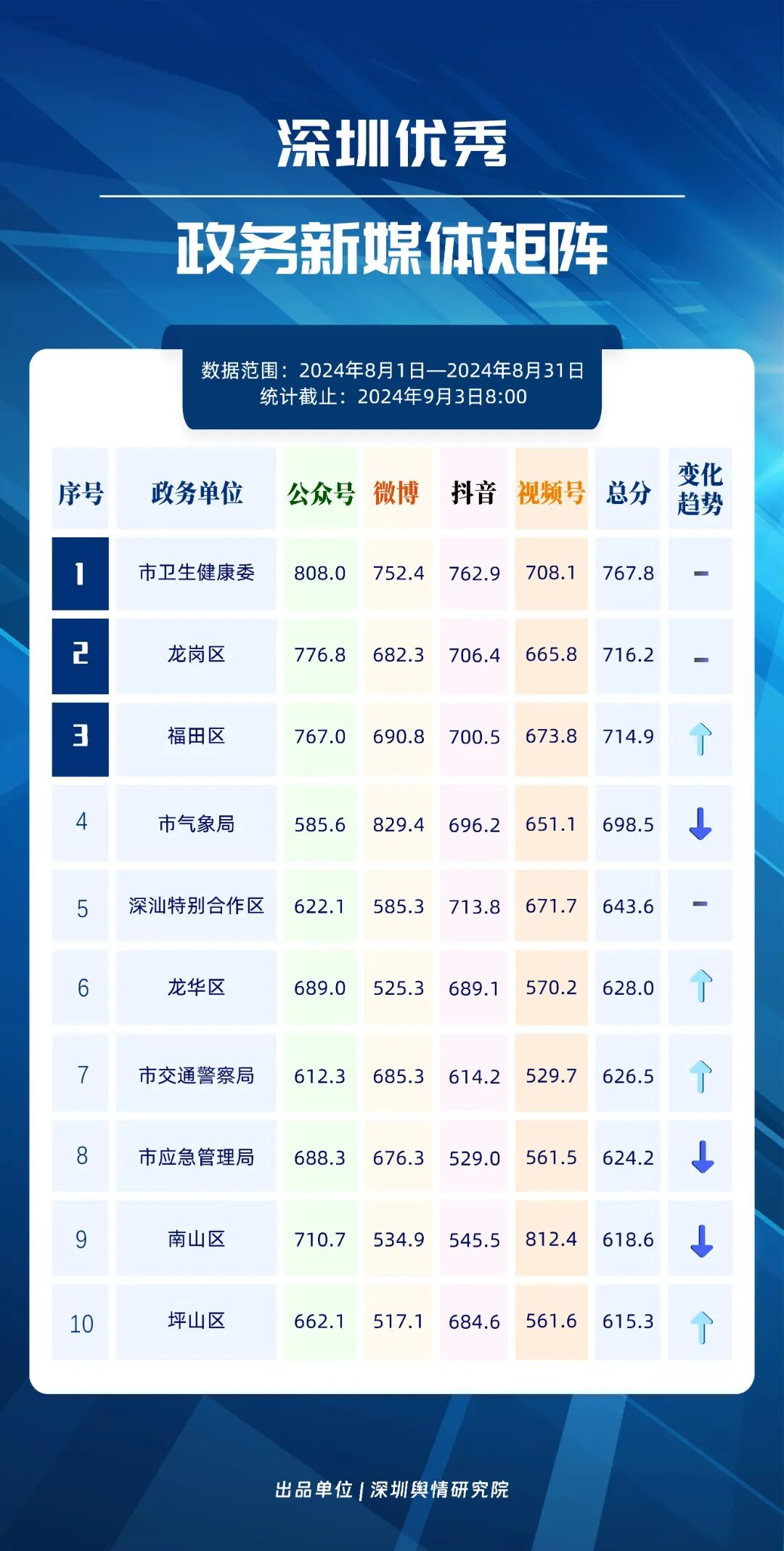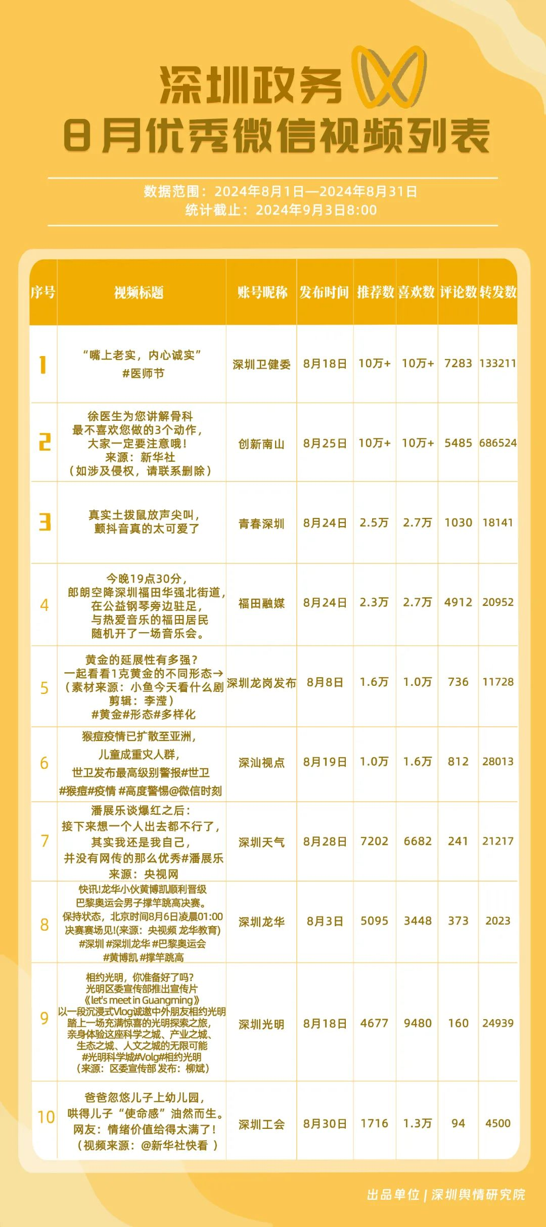8月,“深圳衛(wèi)健委”“深汕發(fā)布”“掌上龍崗”“魅力福田”“深圳天氣”“深圳工會”“DOU愛龍華”“PMC坪山發(fā)布”“深圳交警”和“深圳公安”共10個政務(wù)抖音號獲得優(yōu)秀稱號,“深圳衛(wèi)健委”“深汕發(fā)布”“掌上龍崗”以高分居榜單前三,賬號有關(guān)“醫(yī)師節(jié)”“猴痘”“奧運(yùn)金牌”的視頻獲得了較高的關(guān)注度和討論度,相關(guān)優(yōu)秀視頻在傳播信息的同時,也展現(xiàn)了深圳政務(wù)抖音號在內(nèi)容質(zhì)量、互動性和傳播度方面的實(shí)力。