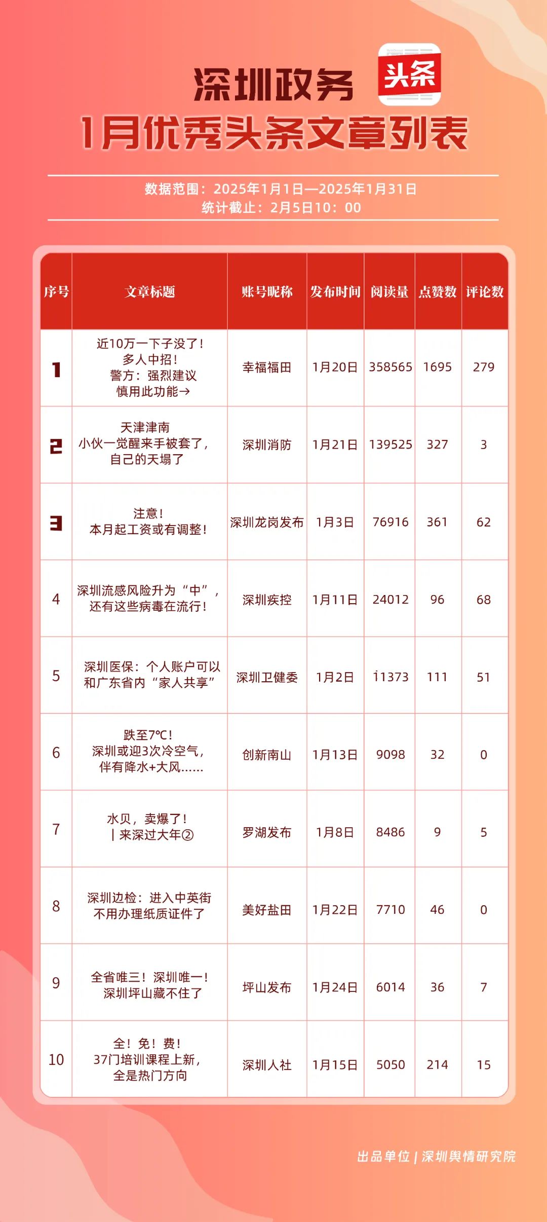 2025年1月期《深圳優(yōu)秀政務(wù)新媒體矩陣》發(fā)布,一同揭曉哪些政務(wù)新媒體矩陣能夠憑借其卓越表現(xiàn)脫穎而出,成為推動政務(wù)信息傳播與服務(wù)模式創(chuàng)新的領(lǐng)航者,引領(lǐng)政務(wù)新媒體運營邁向新高度。