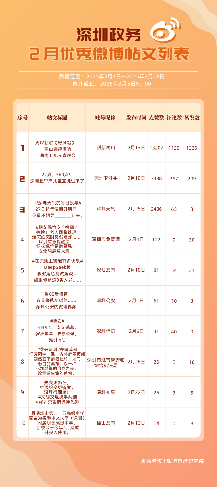 2月,“深圳天氣”“創(chuàng)新南山”“深圳衛(wèi)健委”“深圳消防”“深圳應(yīng)急管理”“福田發(fā)布”“深圳公安”“深汕發(fā)布”“深圳龍崗發(fā)布”“深圳交警”等20個(gè)賬號(hào)入選“優(yōu)秀政務(wù)微博號(hào)”。綜合看來,本月榜單前10名較上期變動(dòng)不大,反映出靠前賬號(hào)運(yùn)營發(fā)揮較穩(wěn)定。其中,“深圳天氣”在榜單中獲得第一名,該賬號(hào)與網(wǎng)民互動(dòng)積極,2月作品總點(diǎn)贊數(shù)超8萬次;“創(chuàng)新南山”“深圳衛(wèi)健委”“深圳消防”“深圳應(yīng)急管理”也各有所長,排名靠前,展現(xiàn)出深圳政務(wù)微博在形象塑造、民生服務(wù)、應(yīng)急科普等領(lǐng)域的持續(xù)影響力。
