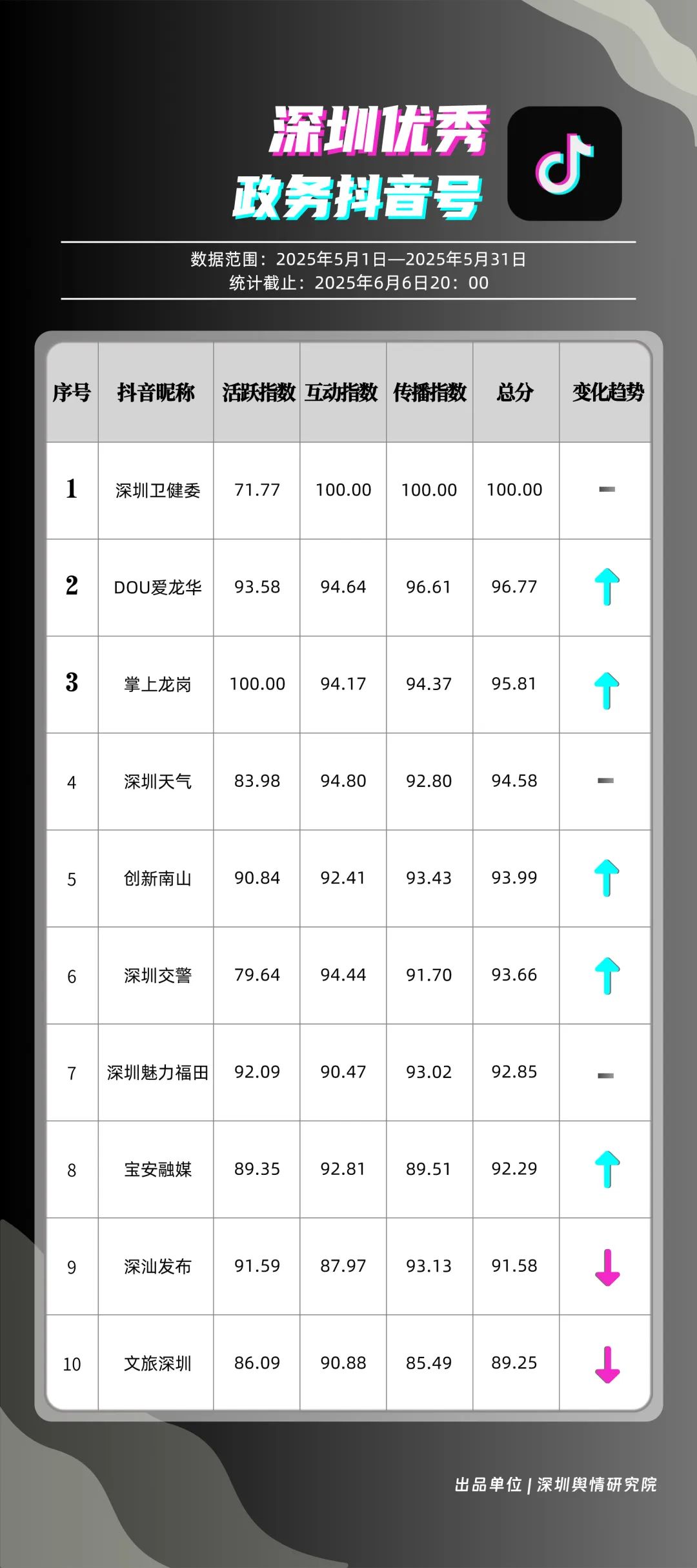 5月,“深圳衛(wèi)健委”“DOU愛龍華”“掌上龍崗”“深圳天氣”“創(chuàng)新南山”“深圳交警”“深圳魅力福田”“寶安融媒”“深汕發(fā)布”“文旅深圳”共10個政務抖音號獲得“優(yōu)秀政務抖音號”稱號。5月,“深圳衛(wèi)健委”憑借3條極具創(chuàng)意的視頻內(nèi)容持續(xù)收獲網(wǎng)民關注,穩(wěn)居榜首之位,成為政務抖音號領域的標桿。“DOU愛龍華”“掌上龍崗”較上個月排名大幅度上升,以96.77分和95.81分位居榜單第2、3名,彰顯出積極探索創(chuàng)新傳播路徑、開拓政務短視頻發(fā)展新可能的決心。以上優(yōu)秀政務抖音號通過多樣化的短視頻形式傳遞政務資訊,為深圳政務新媒體在短視頻領域的蓬勃發(fā)展注入強勁動能,成為政務信息傳播的新標桿。