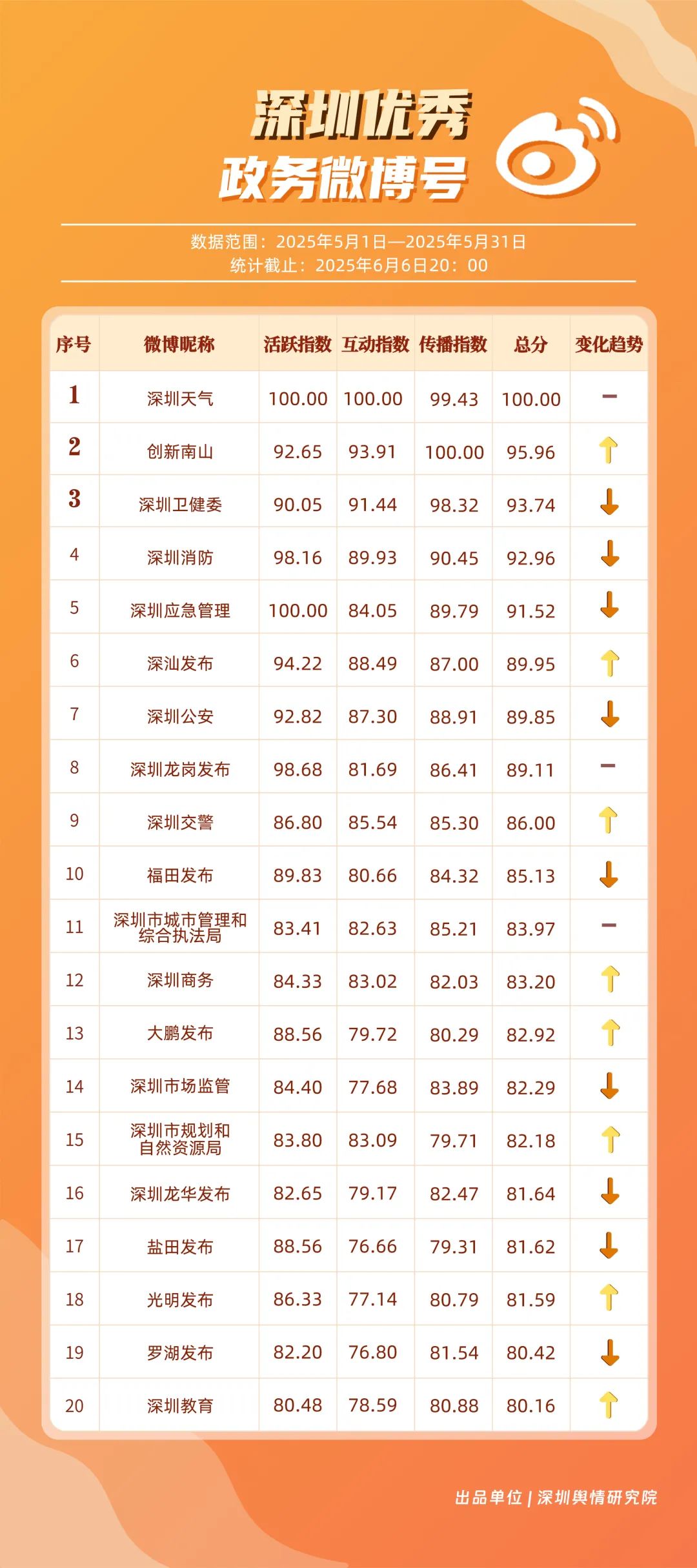 5月,“深圳天氣”“創(chuàng)新南山”“深圳衛(wèi)健委”“深圳消防”“深圳應急管理”“深汕發(fā)布”“深圳公安”“深圳龍崗發(fā)布”“深圳交警”“福田發(fā)布”等20個賬號入選“優(yōu)秀政務微博號”。其中,“深圳天氣”憑借活躍指數(shù)和互動指數(shù)雙項滿分的亮眼成績,穩(wěn)居榜單首位?!皠?chuàng)新南山”以95.96分緊隨其后,在互動、傳播指數(shù)得分大幅提升,排名實現(xiàn)顯著躍升?!吧钲谛l(wèi)健委”“深圳消防”“深圳應急管理”也表現(xiàn)卓越,總分均超過90分,它們憑借權威信息發(fā)布、專業(yè)知識科普,展現(xiàn)了各單位在民生服務、公共安全領域的重要作用。以上優(yōu)秀政務微博號深度契合平臺的傳播特征,善于借助熱門話題擴大影響力,以鮮明的賬號特色展現(xiàn)區(qū)域風采。