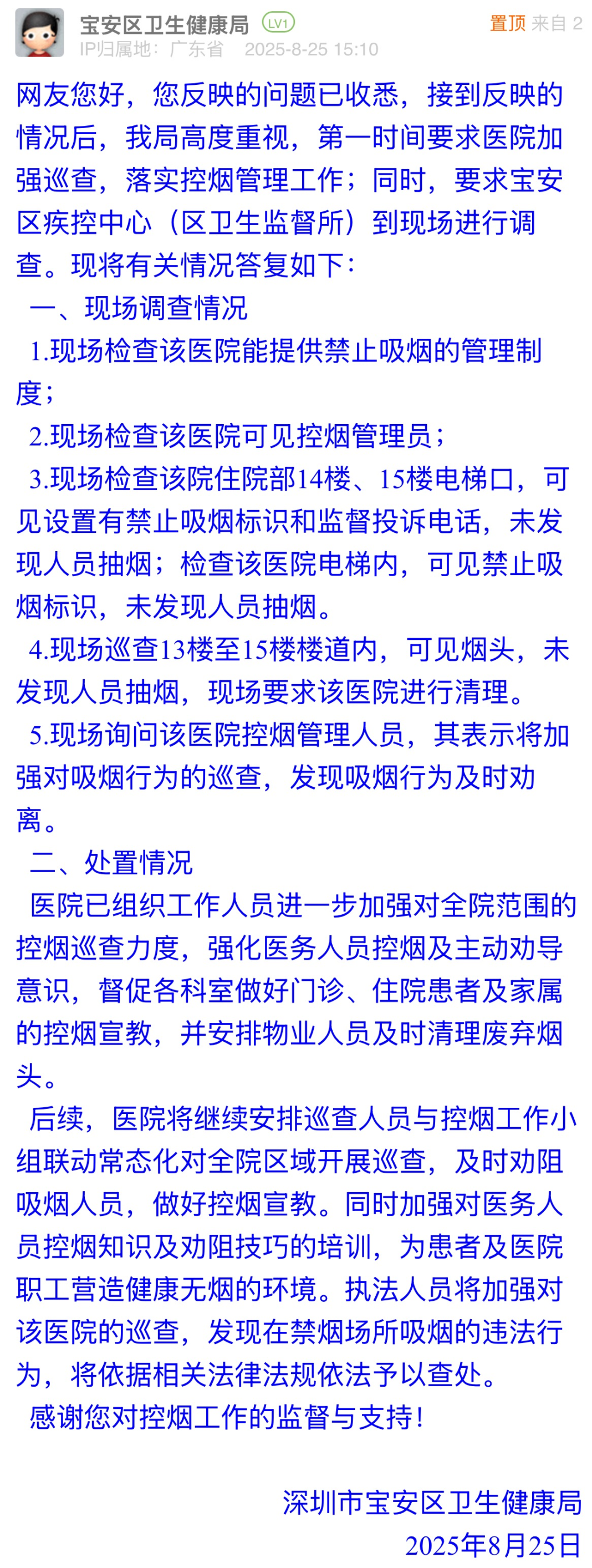優(yōu)化建議:接到市民反饋后,寶安區(qū)衛(wèi)生健康局快速組織現(xiàn)場調查,核實醫(yī)院有禁煙制度、控煙管理員在崗,基礎控煙措施核查到位,值得點贊。但回應中多次強調“未發(fā)現(xiàn)人員抽煙”,回避對歷史吸煙行為處置、煙頭來源及勸阻機制失效的解釋,與市民關切脫節(jié),難以消除市民對醫(yī)院日??責熌芰Φ膿鷳n,建議完善具體控煙措施,如加裝煙感報警裝置,建立核查公示制度等,筑牢“無煙醫(yī)院”防線。