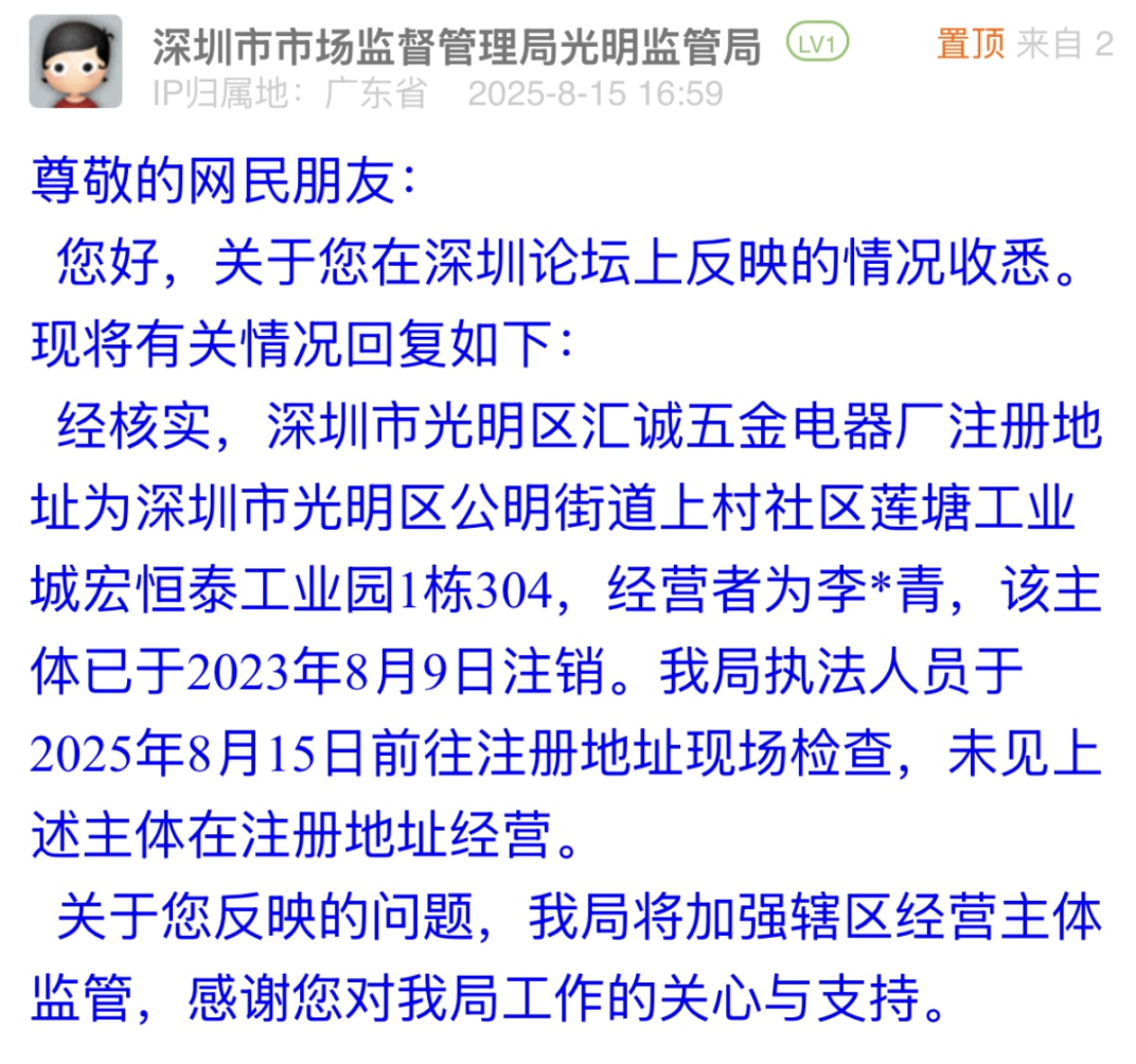 優(yōu)化建議:深圳市市場監(jiān)督管理局光明管理局的回應中,核實了涉事電器廠已注銷,且不在注冊地經營,也提及加強轄區(qū)主體監(jiān)管,但市民反映的排插套用注銷主體信息銷售、違規(guī)標識3C標志等關鍵問題,未得到明確解答。若回應中能豐富指引類內容,如告知市民可向平臺追責的途徑、提交證據(jù)的具體方式,為市民維權提供清晰方向,將更貼合市民需求,也能讓回應更具實際意義。