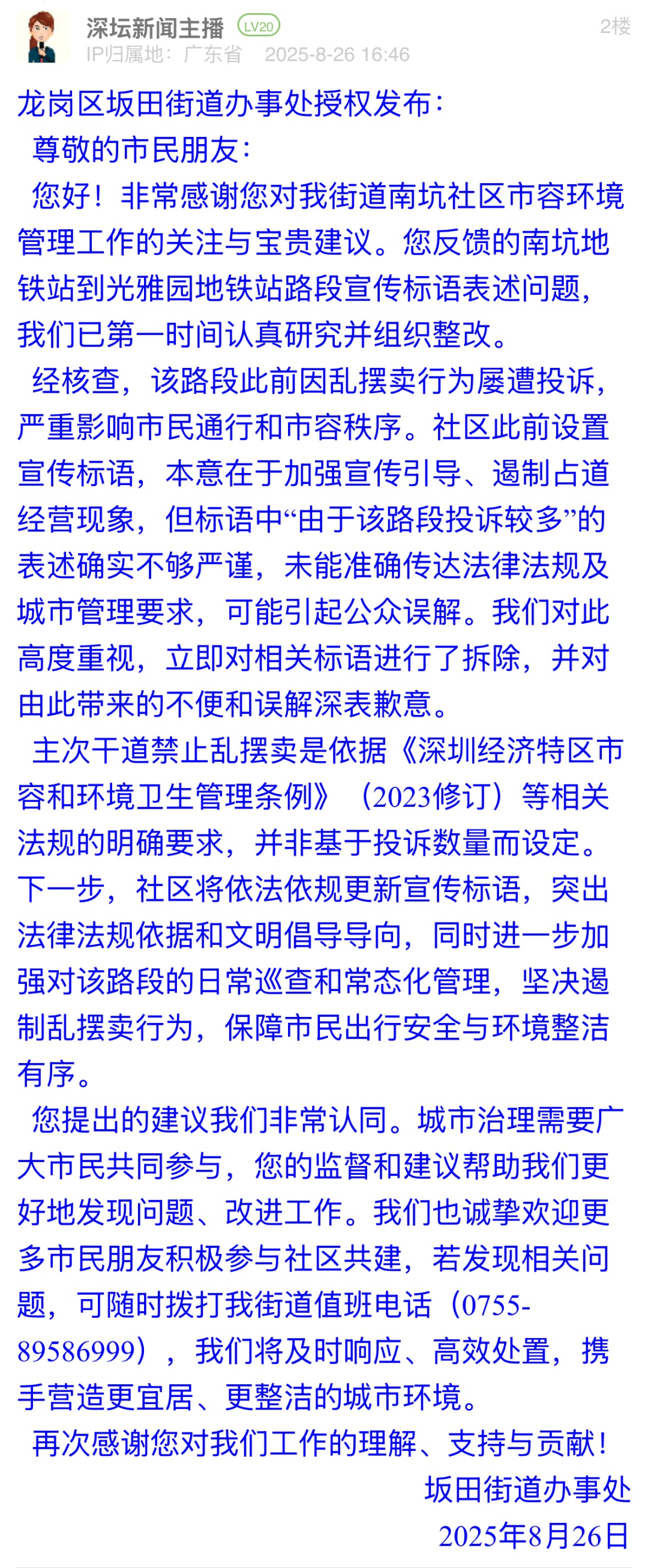 案例點評:標語表述不嚴謹可能引發(fā)公眾誤解,坂田街道辦展現(xiàn)出高效務實的態(tài)度,第一時間拆除涉事標語,計劃更新標語,明確標語中提及的禁擺依據(jù)為法規(guī)要求而非投訴數(shù)量?;貞校值乐鲃又虑覆⒐_整改邏輯,展現(xiàn)“直面問題不推諉”的擔當,更以“邀請市民參與共建”為切入點,構建“政府主導+公眾監(jiān)督”的治理閉環(huán)。此次整改有效化解因標語表述不當引發(fā)的公眾疑慮,彰顯了“以民為師”的共治智慧。
