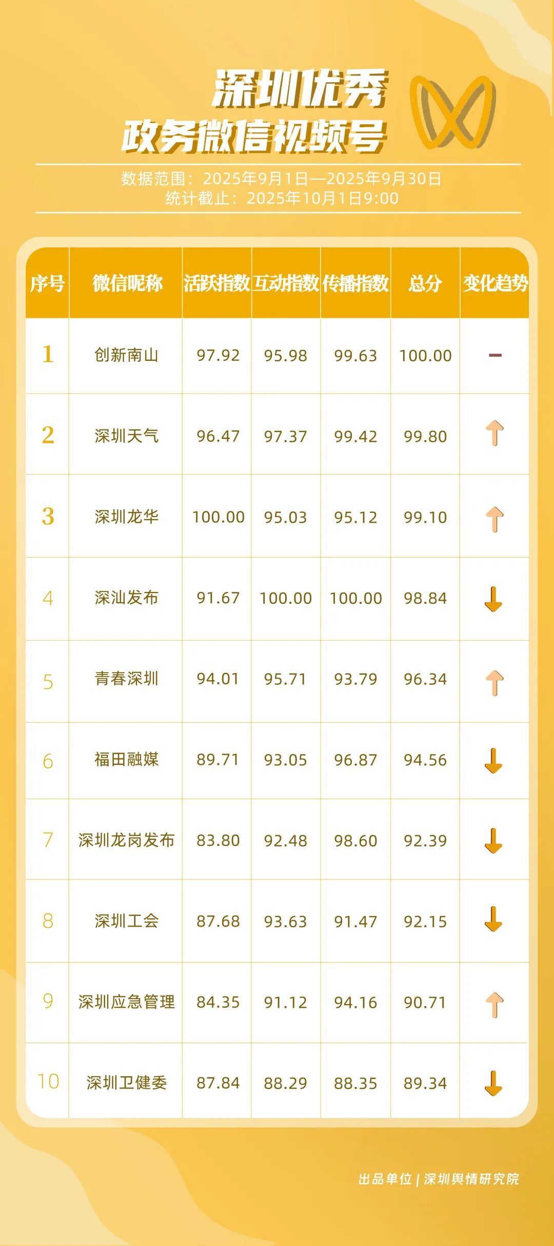 9月,深圳政務(wù)新媒體矩陣持續(xù)優(yōu)化內(nèi)容生態(tài),各單位依托平臺特色深化服務(wù)效能,南山區(qū)、市衛(wèi)生健康委員會、市氣象局(臺)、龍崗區(qū)、福田區(qū)、龍華區(qū)、深汕特別合作區(qū)、市應(yīng)急管理局、中國共產(chǎn)主義青年團(tuán)深圳市委員會、光明區(qū)的新媒體矩陣入選“深圳優(yōu)秀政務(wù)新媒體矩陣”榜單。9月,南山區(qū)在短視頻平臺表現(xiàn)突出,抖音、微信視頻號平臺均獲滿分;市衛(wèi)生健康委員會輸出深度內(nèi)容,位列榜單第二;市氣象局(臺)新媒體矩陣居于榜單第三,在9月發(fā)布臺風(fēng)相關(guān)天氣提醒,獲得公眾廣泛關(guān)注。此外,龍崗區(qū)、福田區(qū)、龍華區(qū)、深汕特別合作區(qū)新媒體矩陣持續(xù)推出優(yōu)質(zhì)內(nèi)容,共同展現(xiàn)了深圳在塑造現(xiàn)代化形象、提升數(shù)字治理能力上的創(chuàng)新引領(lǐng)作用。
