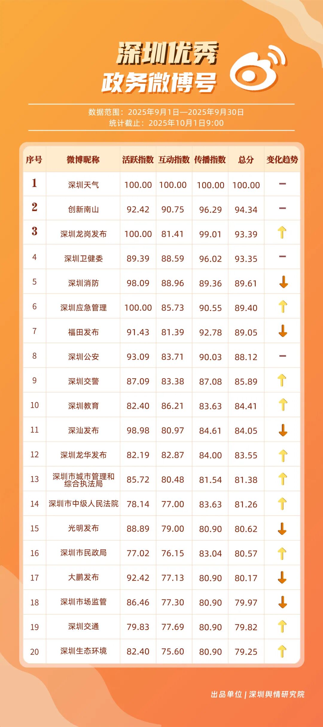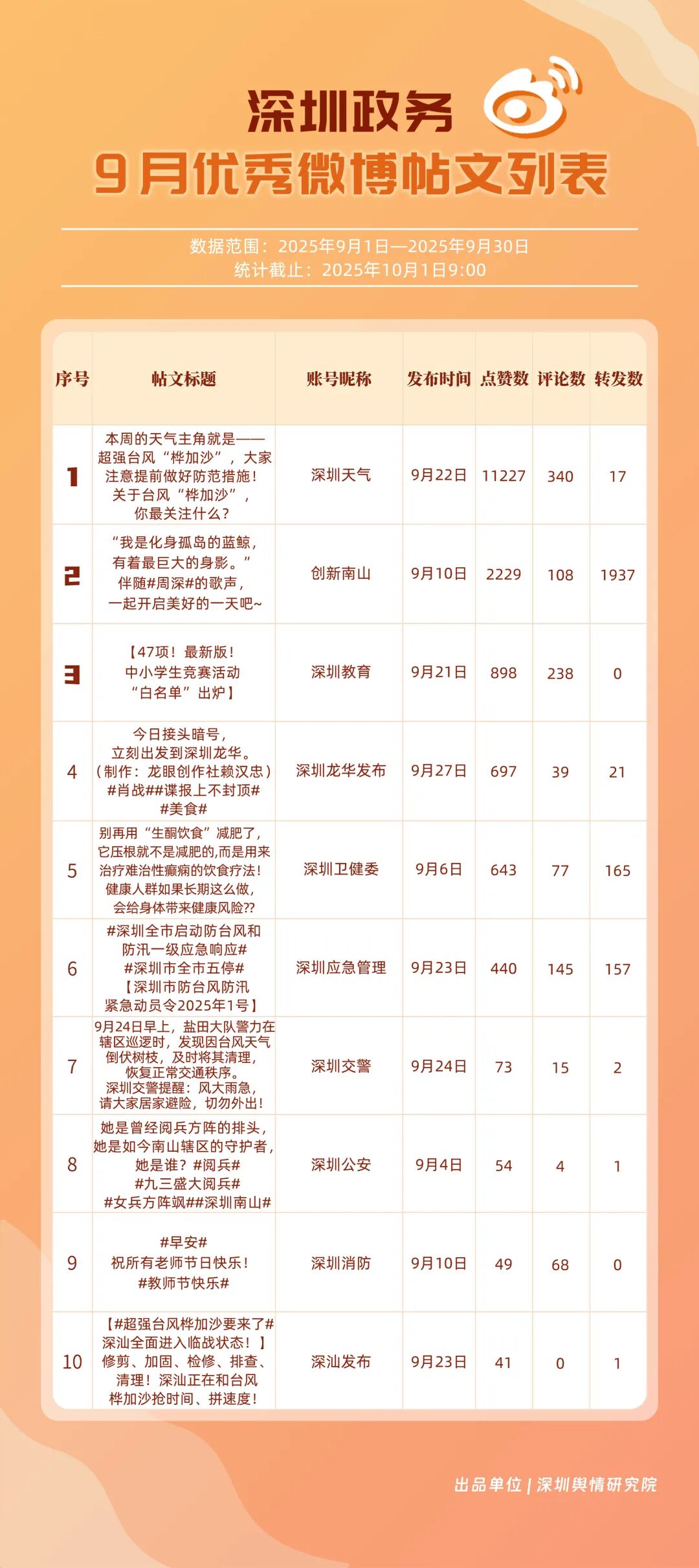 9月,20個賬號入選“優(yōu)秀政務(wù)微博號”榜單,其中包括:“深圳天氣”“創(chuàng)新南山”“深圳龍崗發(fā)布”“深圳衛(wèi)健委”“深圳消防”“深圳應(yīng)急管理”“福田發(fā)布”“深圳公安”“深圳交警”“深圳教育”等。其中,“深圳天氣”蟬聯(lián)榜首,尤其9月出現(xiàn)臺風(fēng)天氣,賬號受關(guān)注度再提升;“創(chuàng)新南山”賬號以多維度內(nèi)容策略實(shí)現(xiàn)傳播效能提升,其內(nèi)容中與歌手周深的聯(lián)動也成為一大亮點(diǎn),獲得了較好傳播效果,以94.34分排名榜單第二;“深圳龍崗發(fā)布”“深圳衛(wèi)健委”兩賬號得分均在93分以上,在區(qū)域宣傳、內(nèi)容科普方向發(fā)力。上榜優(yōu)秀微博賬號展現(xiàn)出較高的內(nèi)容創(chuàng)新能力,以年輕化語態(tài)構(gòu)建傳播體系,形成兼具專業(yè)性與傳播力的優(yōu)秀案例。