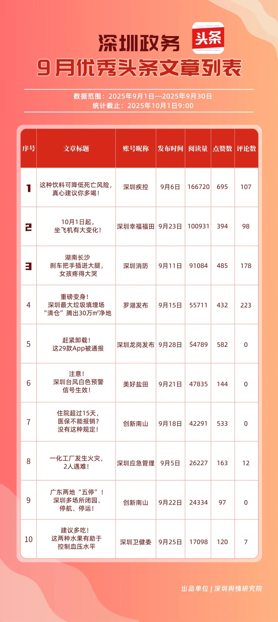 9月,“深圳幸福福田”“深圳疾控”“深圳消防”“羅湖發(fā)布”“深圳龍崗發(fā)布”“創(chuàng)新南山”“深圳龍華”“青春深圳”“深圳人社”“濱海寶安”共10個政務(wù)頭條號入選“優(yōu)秀政務(wù)頭條號”榜單?!吧钲谛腋8L铩狈€(wěn)居榜單首位,在傳播、互動等方面均表現(xiàn)卓越;“深圳疾控”關(guān)注民生健康,有關(guān)“喝茶的好處”“非正規(guī)醫(yī)美針風(fēng)險(xiǎn)”兩篇文章閱讀均超10萬次,為市民提供健康信息;“深圳消防”聚焦消防安全領(lǐng)域,提醒市民注意安全。相關(guān)上榜賬號表現(xiàn)優(yōu)異,注重內(nèi)容實(shí)用化、互動場景化,彰顯了政務(wù)新媒體的服務(wù)效能。